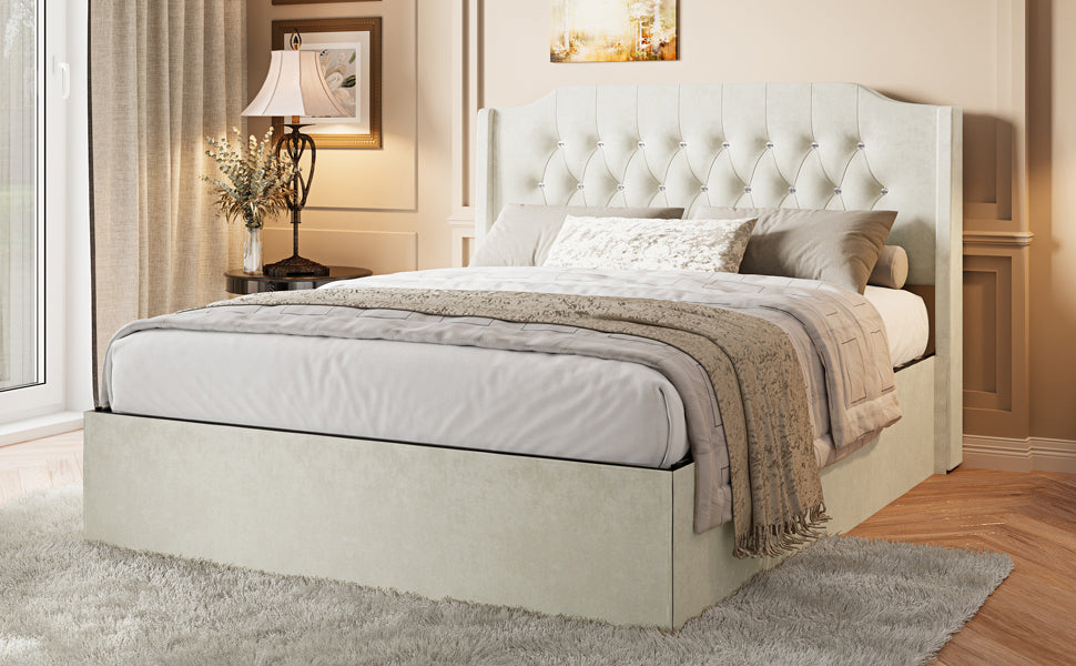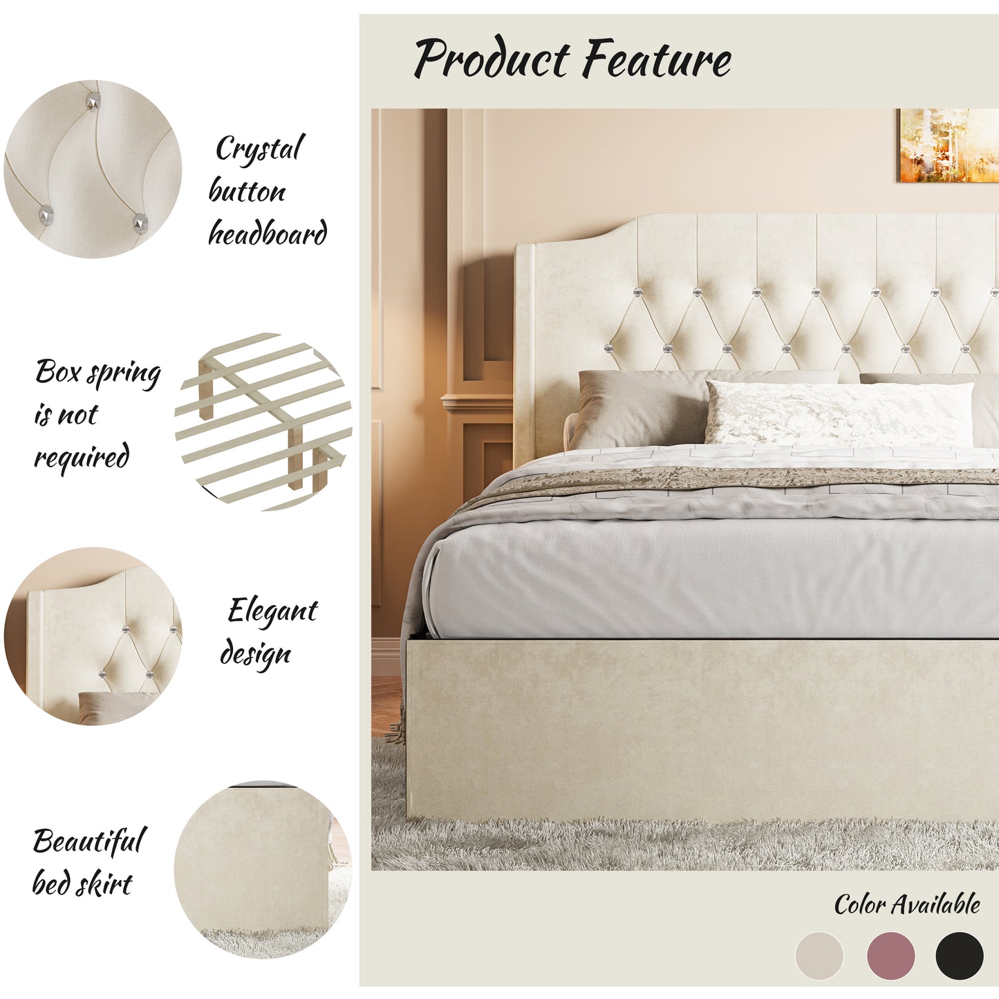 Queen Size Tufted Upholstered Bed Frame with Crystal Button Accents, Bed Frame with Wingback Headboard and Under-Bed Storage Space, No Box Spring Needed,Beige