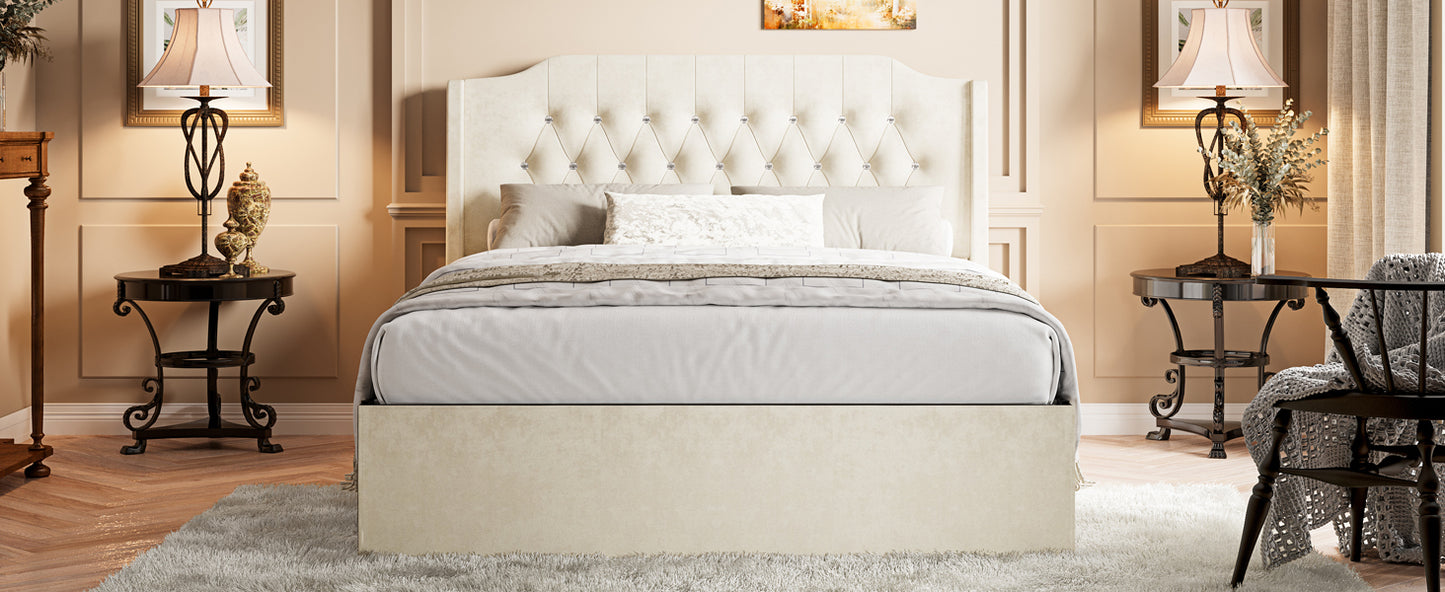 - Elegant Tufted Upholstered Wingback Design: This Queen-size bed frame boasts a luxurious tufted upholstery with soft fabric and delicate crystal button accents, elevating the style and sophistication of your bedroom. The wingback headboard provides both comfort and practicality, offering a plush surface to lean against while also featuring convenient shelf space on top—perfect for placing your glasses, phone, or other small items