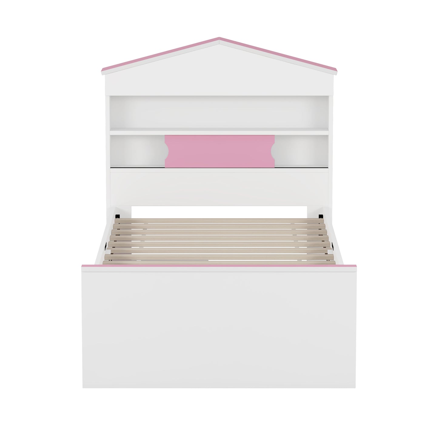 Twin Size House-Shaped Wooden Bed with Storage Shelf on the Headboard, Built-in Two Storage Drawers, Pink