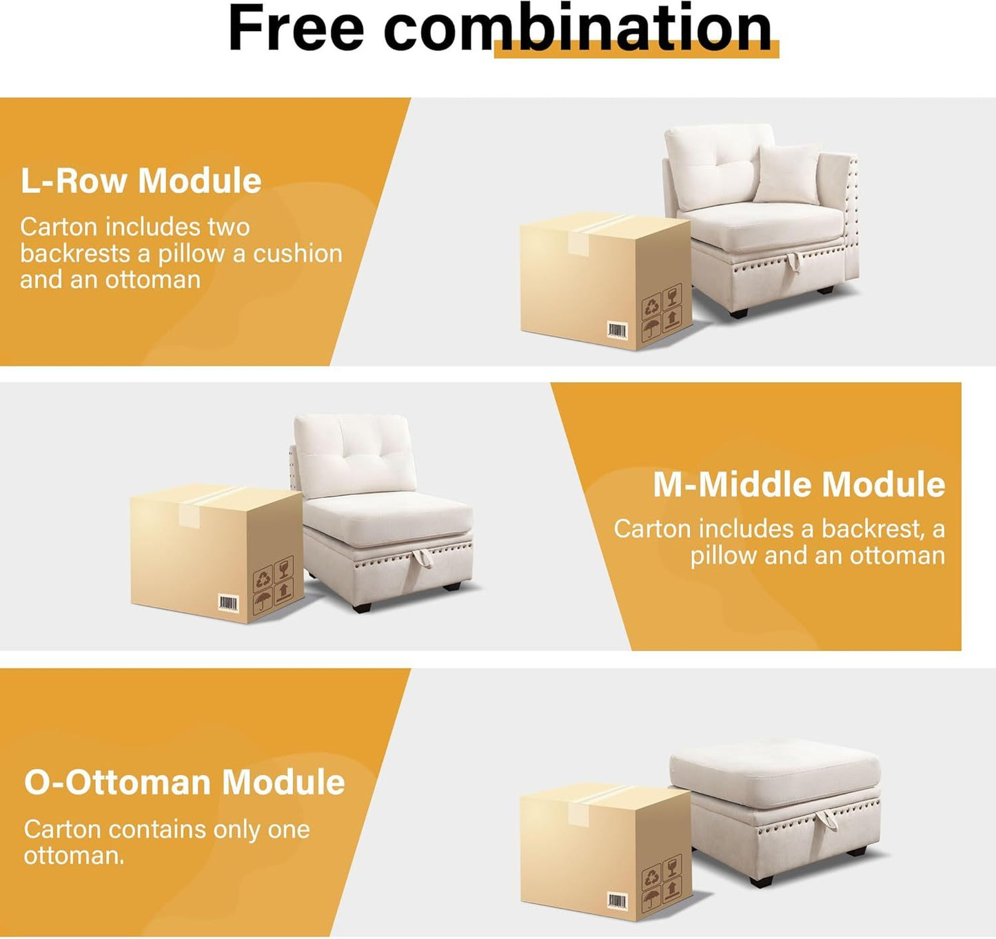 Vintage Modular Sectional Sofa, Convertible Multiple Combination Sofa Couch with Storage, Memory Foam, Vintage Copper Nail Modular Sectionals L-Row Module Beige (1 side stool)
