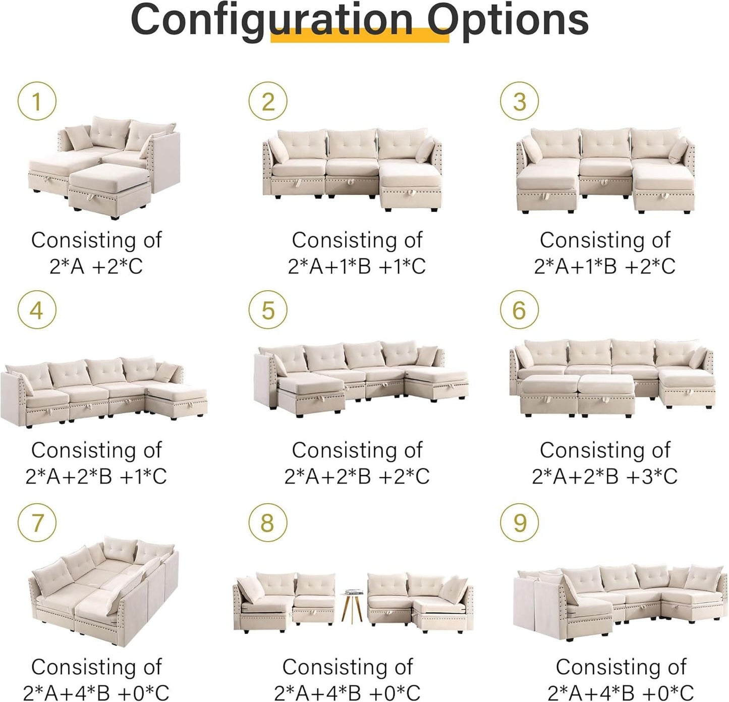 - Unique Design: 1: Adds vintage brass nails to each module, each one hammered in by hand by workers, giving the sofa a distinctive look from other modular sectional sofas. 2: Larger and wider seats (each module: 25x25x17 inch) provide more comfort space. Increase the hidden storage space (25*25*7 in³) in each sofa seat, enough to hold toys, blankets, decorations and more.