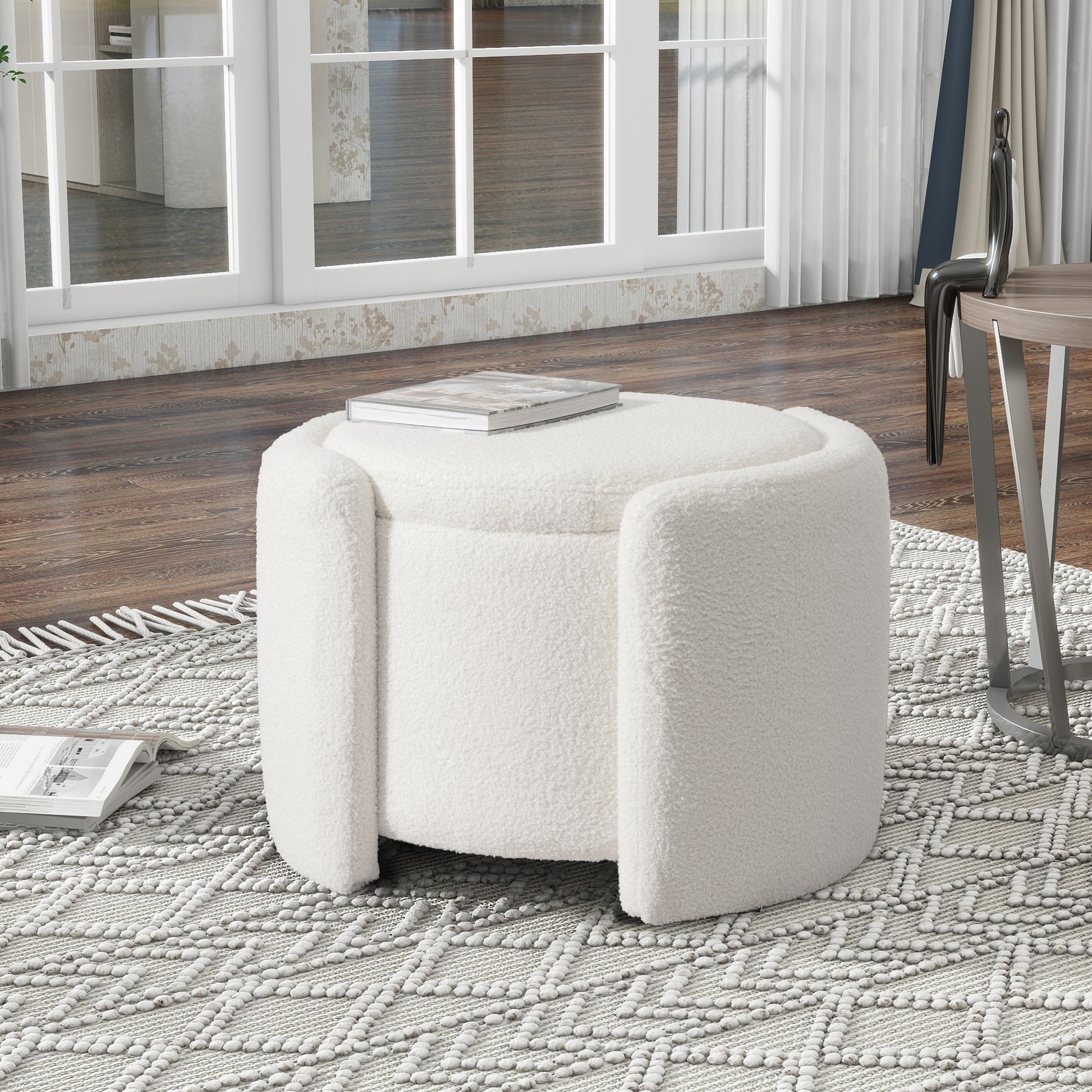 Round Ottoman teddy fleece cushioned footpads living room and bedroom footstool with storage space (White)