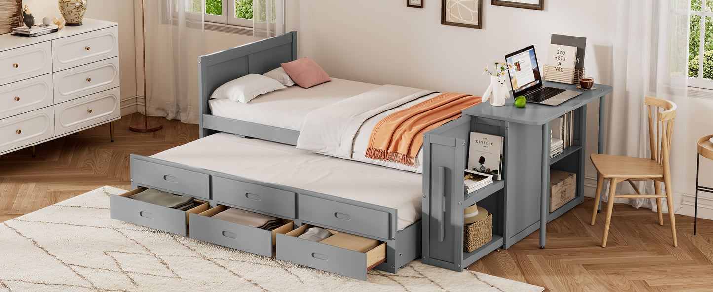 Twin Size Multifunctional Wood Platform Bed with Desk and Storage Shelf at the End of the Bed, Built-in Trundle and 3 Drawers, Gray