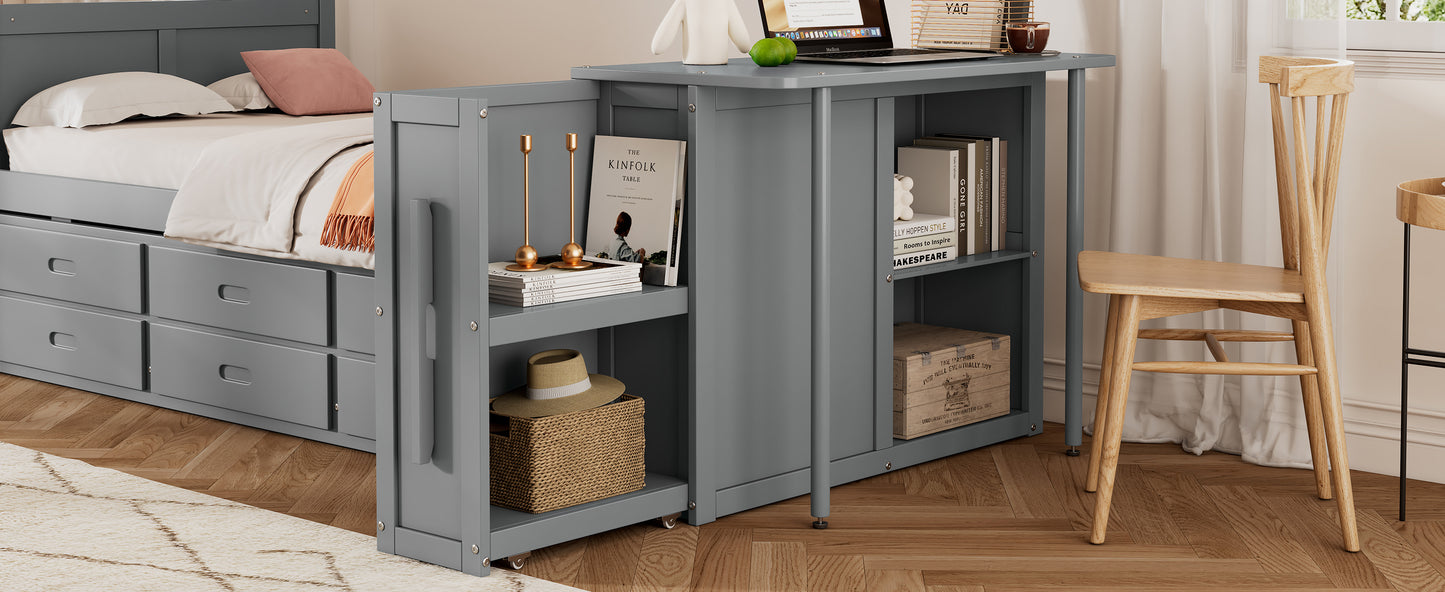 - Space-Saving Design: This twin-size bed integrates a built-in desk, trundle, and storage shelf at the foot of the bed, making it perfect for compact bedrooms or multifunctional spaces.