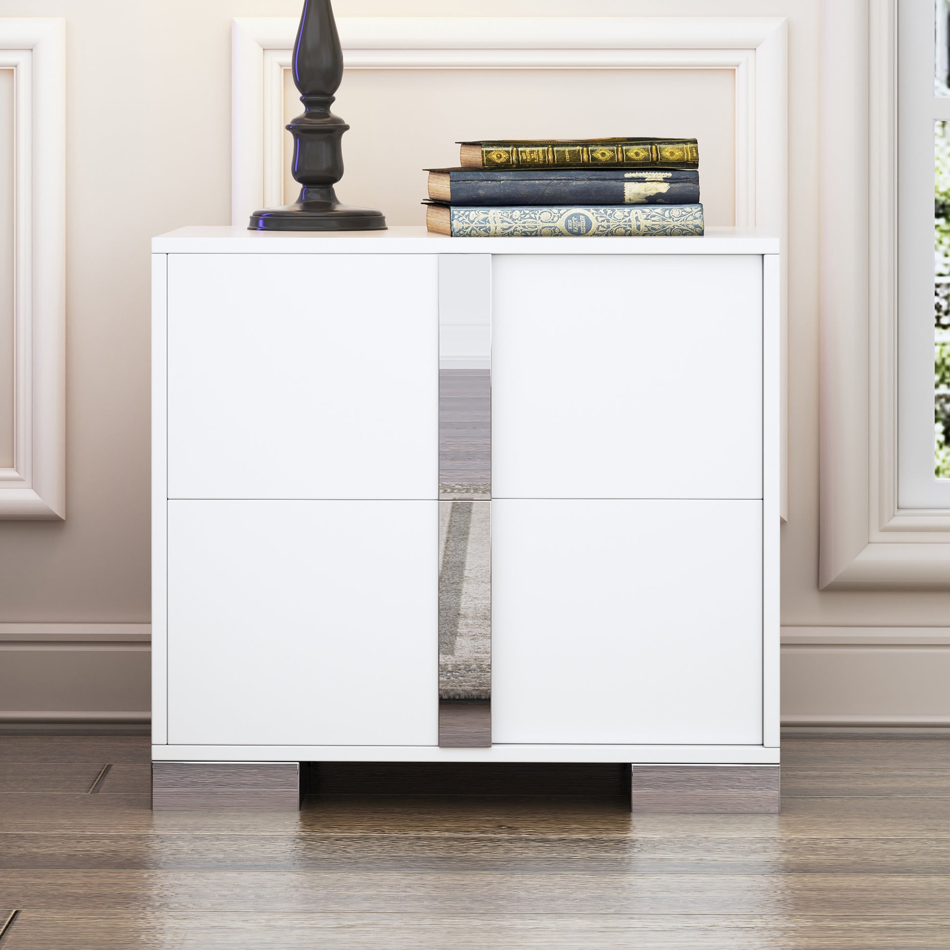 Elegant Nightstand with Metal Handle,Mirrored Bedside Table with 2 Drawers for Bedroom,Living Room,White