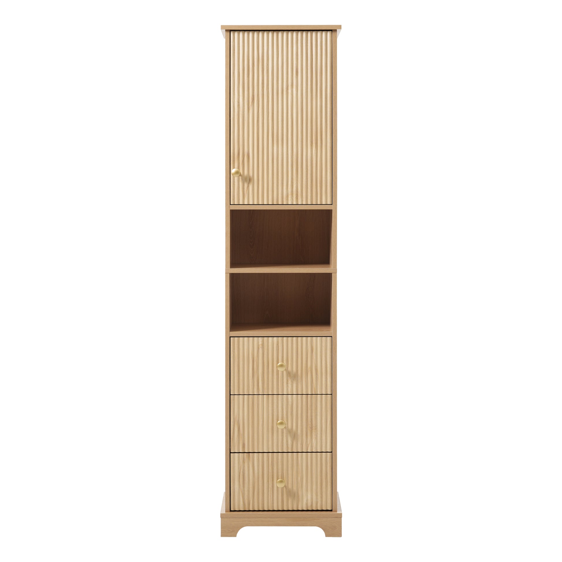 67.7' Tall Traditional American Style Bathroom Cabinet with 1 Door, 3 Drawers, Open Storage, Gold Handles, Melamine Finish, Wood Color
