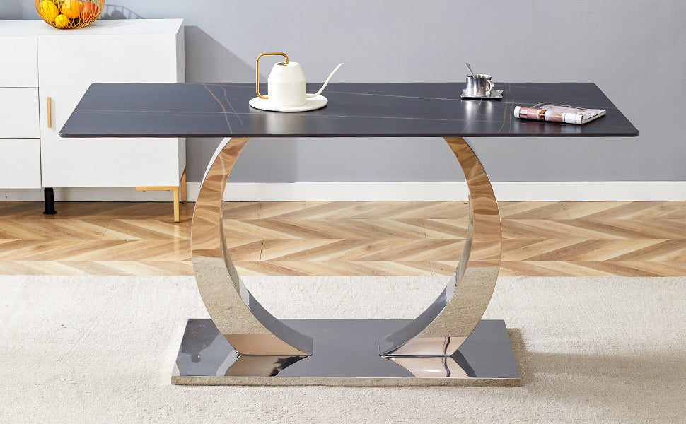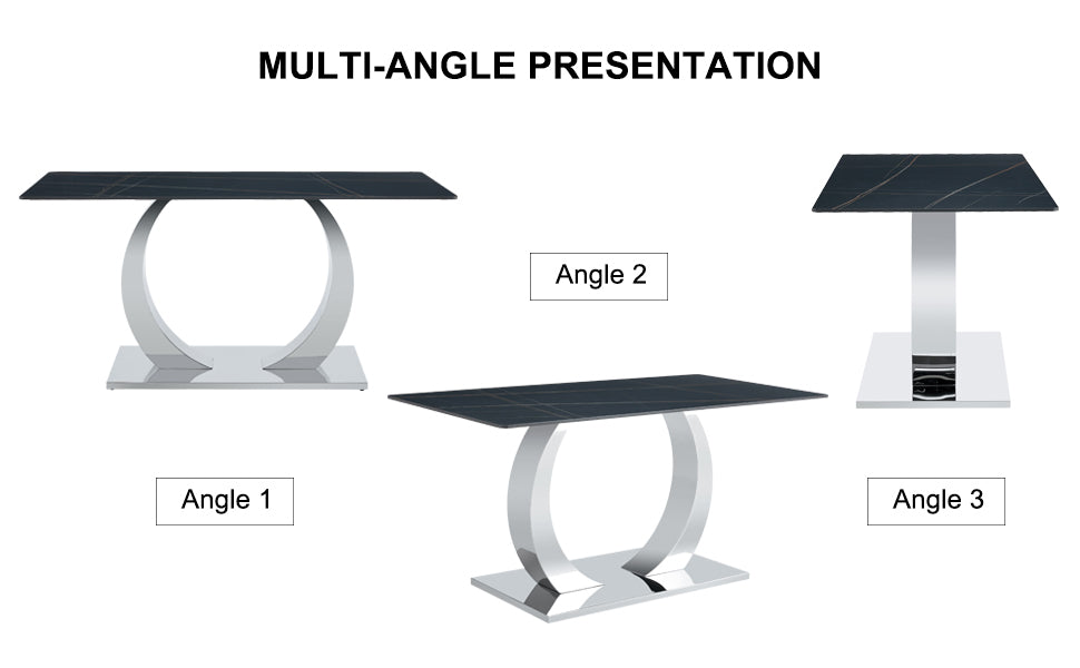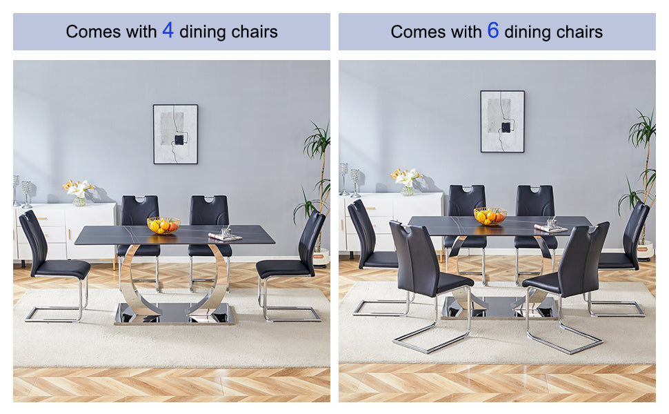 Table and chair set.63x31.5-inch Sintered Stone Dining Table.Paired with 6 Uniquely designed black dining chairs with Silver Metal Leg.Black Texture Design Tabletop,Silver stainless steel table leg.