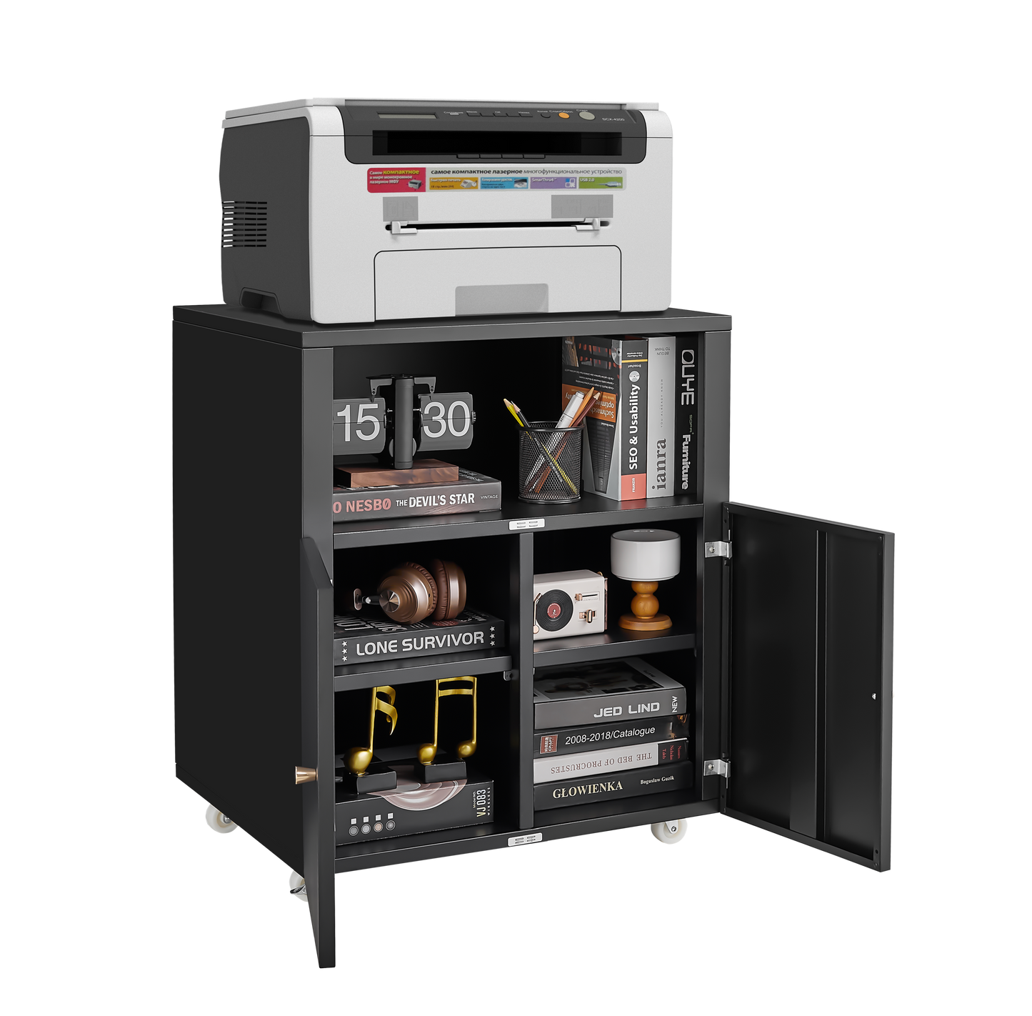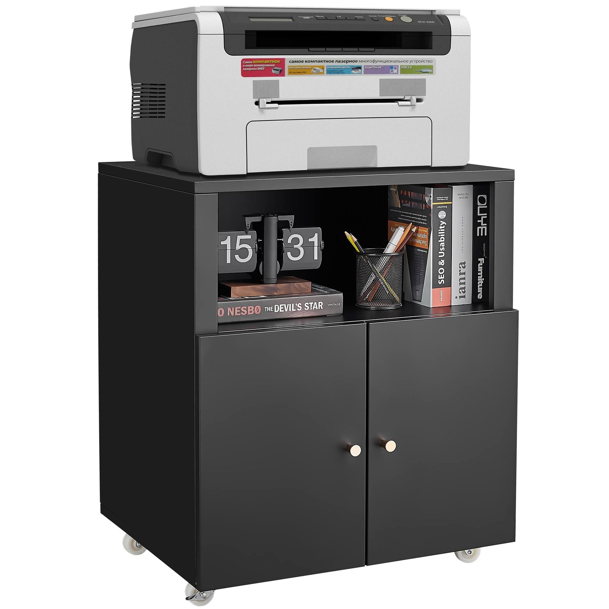 - This rolling printer stand featured with a door, which allow convenient file access and add security that keep your business private. The open shelves is great to storage and display for binders, folders, books, furnishing articles or decor. You can also adjust the shelves height as your different needs.