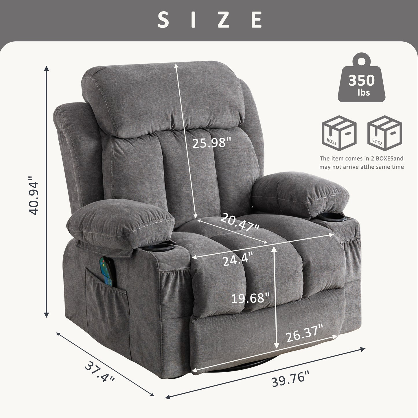 Vanbow.Swinging recliner massage heated sofa, with USB and 2 cup holders in side pockets, Package A and B (gray velvet)