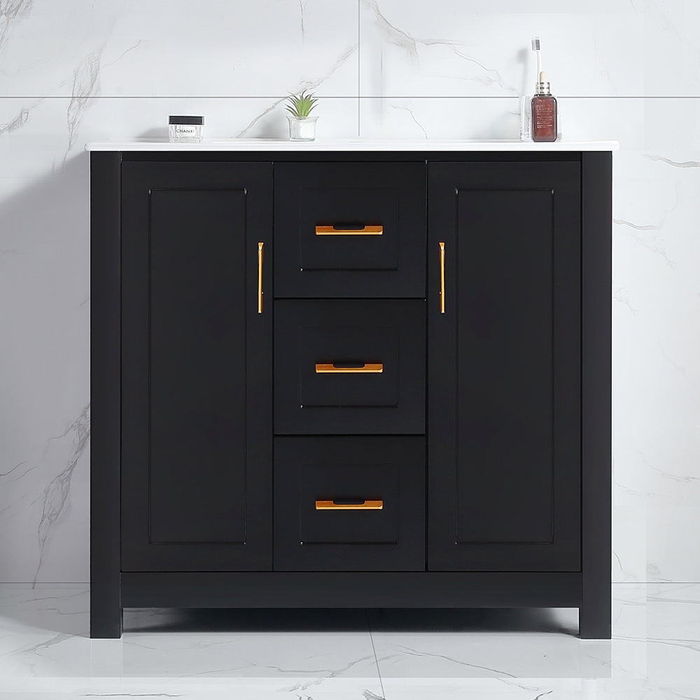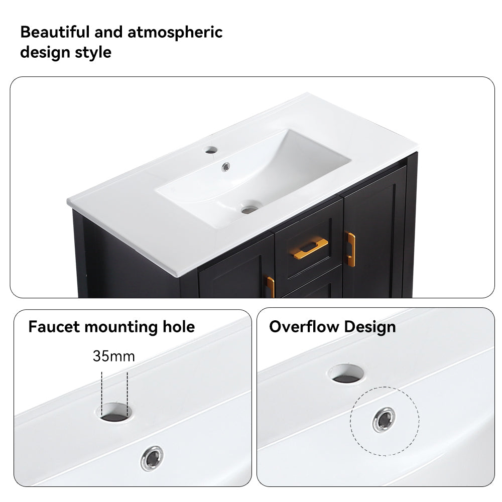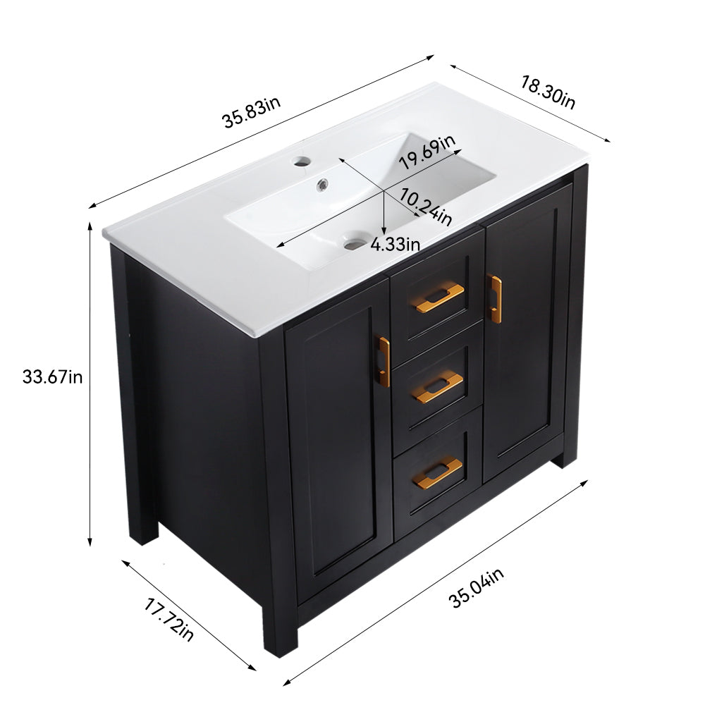 - [Elegant and Stylish Appearance] Our 36-inch Bathroom Cabinet features sleek lines and a modern design. With its sophisticated black exterior, fashionable handles, and a white sink, it adds a touch of brilliance to your bathroom decor. The combination of style and functionality creates an inviting and aesthetically pleasing ambiance.