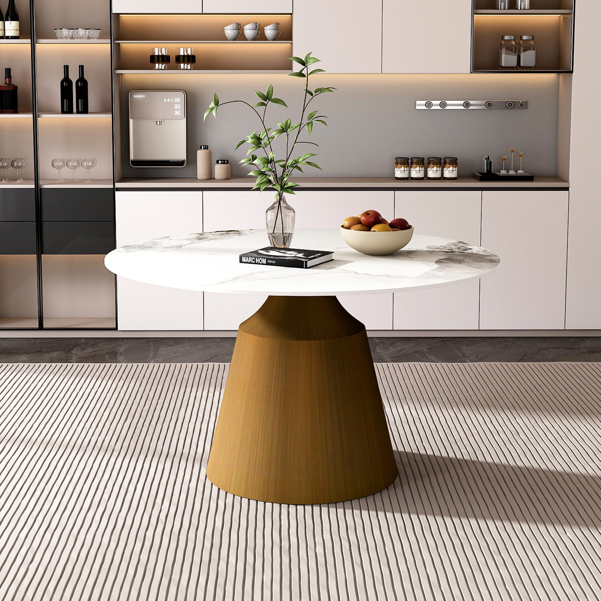 53' Marble Round Dining Table, Sintered Stone Round Dining Table with Stainless Steel Cone Base, Sturdy Dining Table for Kitchen Dining Room for 4-6 people-Bronzed Base