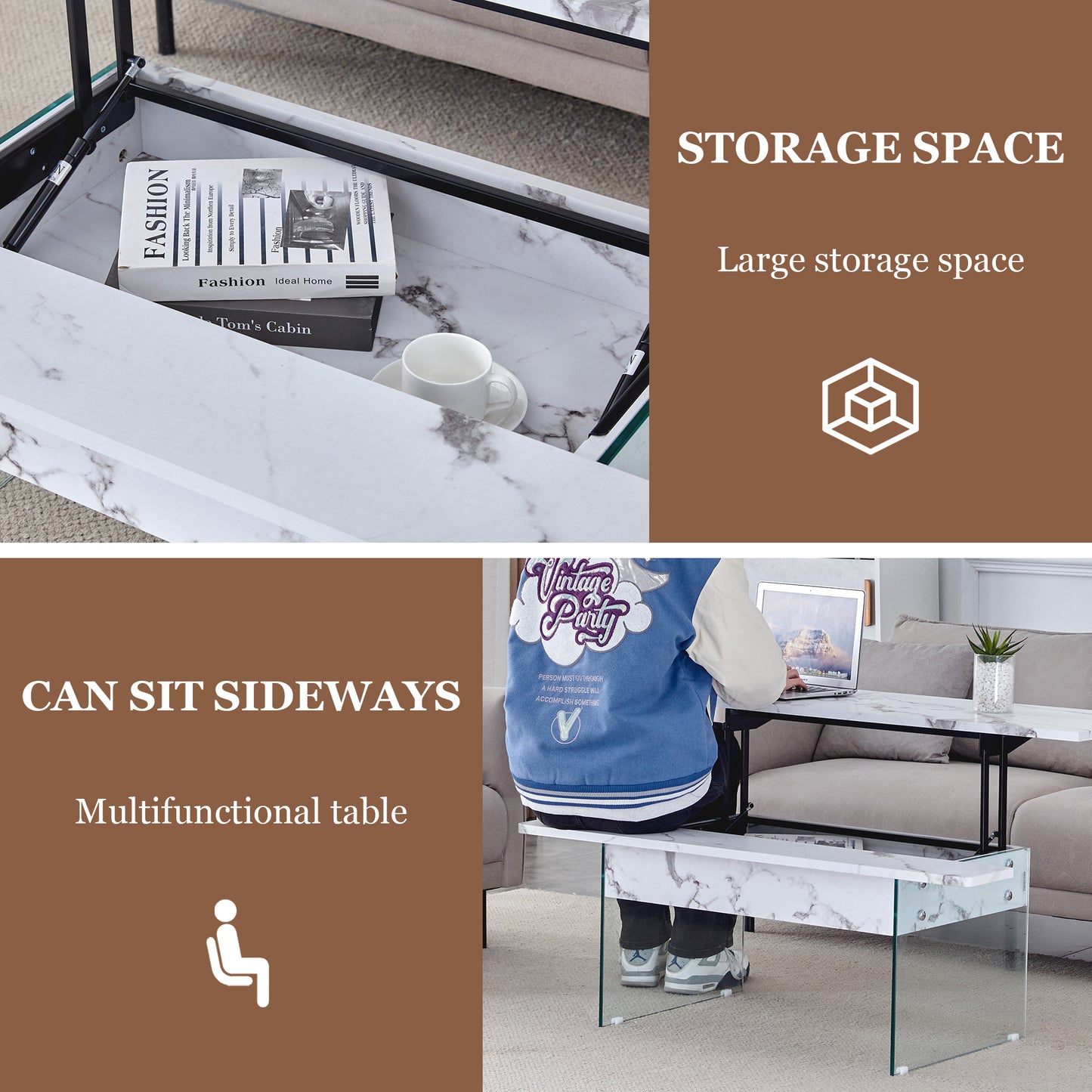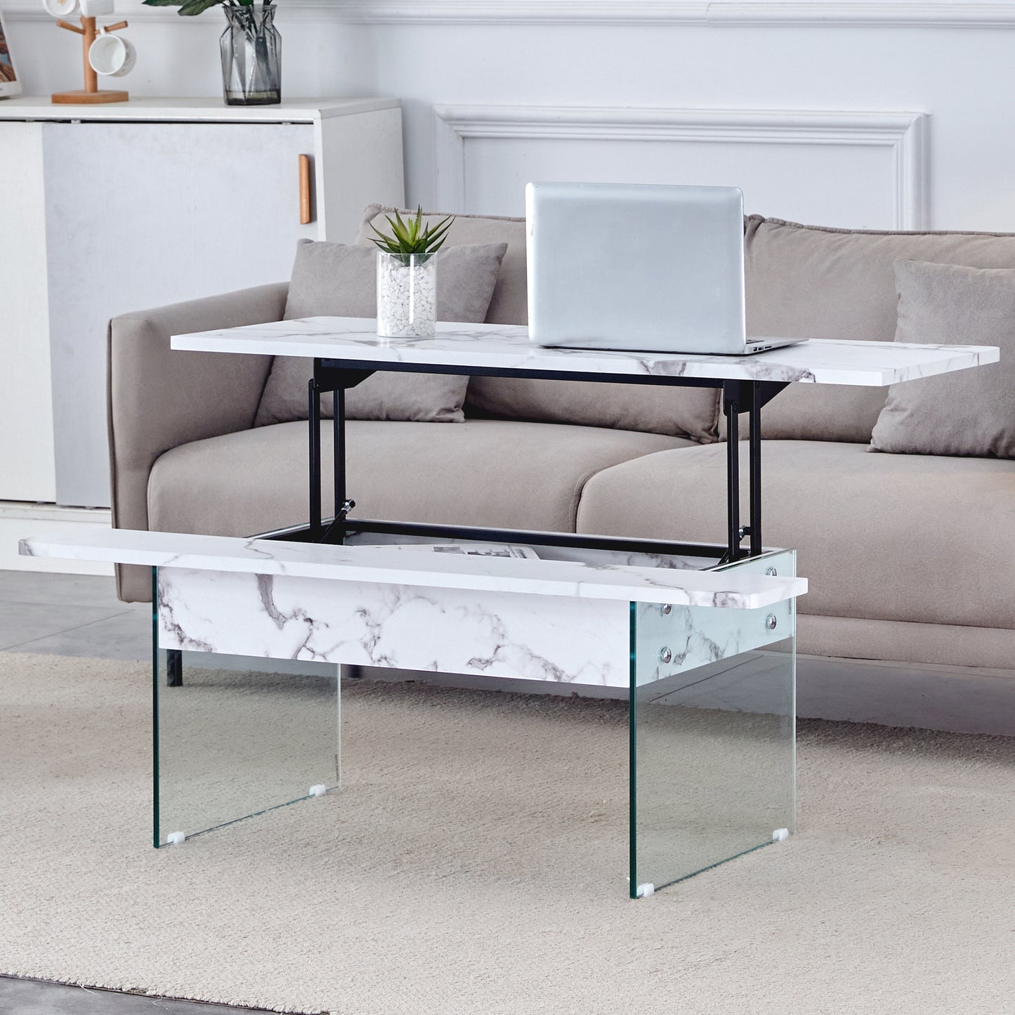 Multifunctional Lift Top Coffee Table -White Marble Pattern, Essential for Modern Homes.Tempered Glass Legs,Multiple Color Options,Lift Top Feature.Perfectly Fitting Into Both Living Rooms And Office.