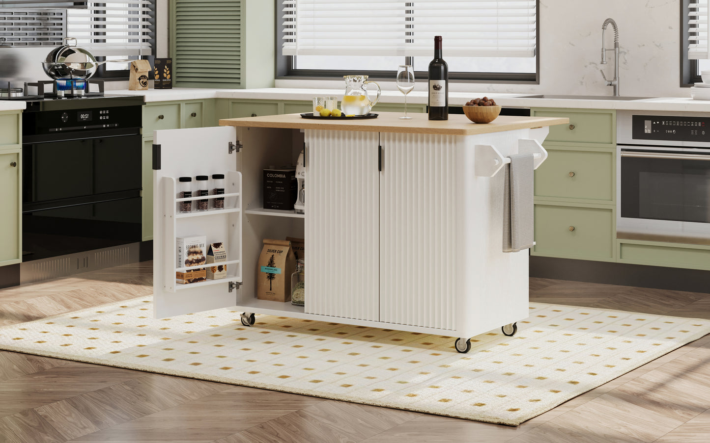 Highlights | [Large Drop Leaf][2 x Internal Storage Racks][Adjustable Shelf] [Unique Waveform Fluted Panel][Towel Rack][Smooth Curved Edge] [0.98inch Thick Counter Top][Ash Veneer Cabinet] [Cover With Paint][4 * 360°Smooth Rotation Wheels ] [Stationary Storage Island][Hydraulic Hinge][Solid Pine Wood Feet] |