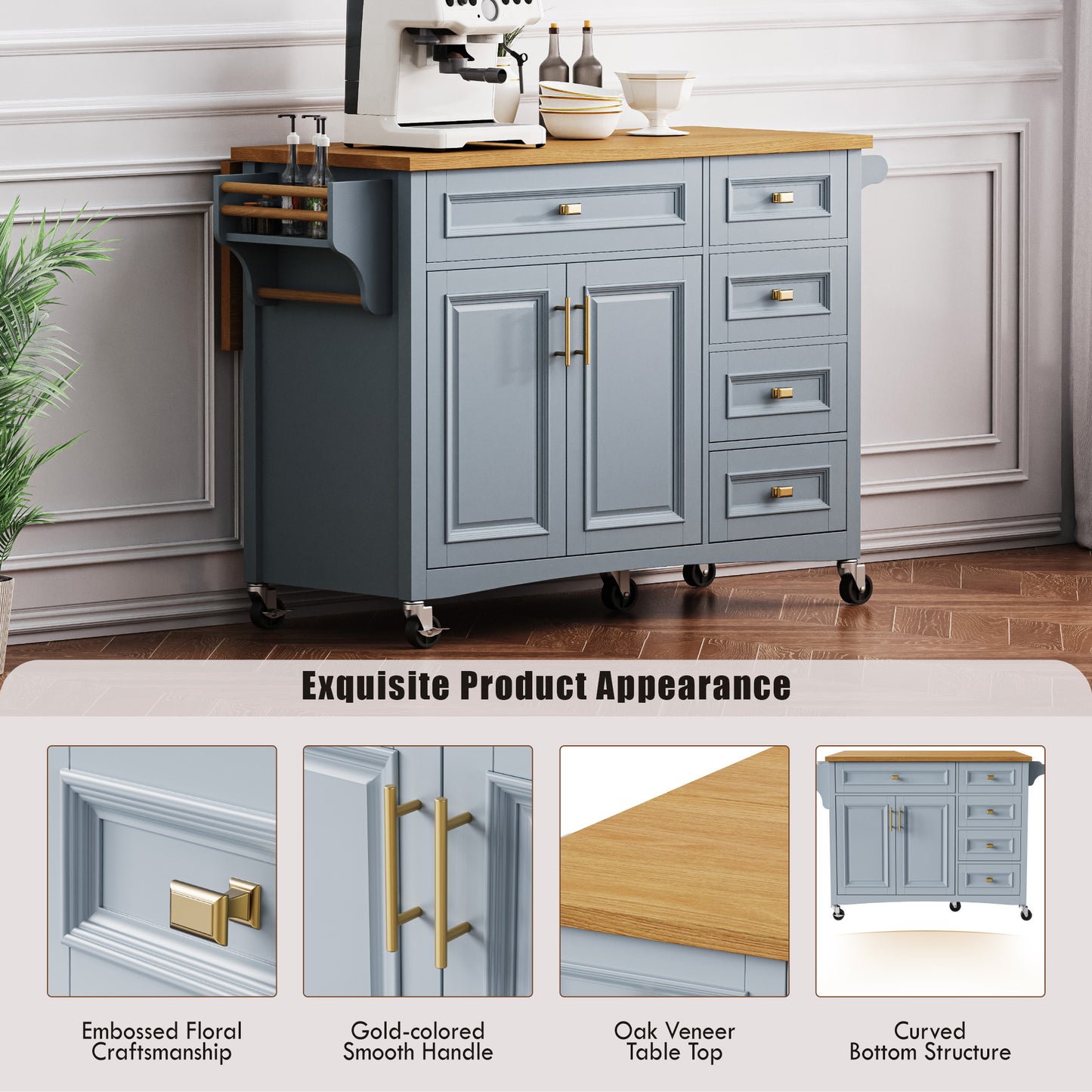 K&K 52'' Kitchen Island with Drop Leaf, Embossed Texture Kitchen Island on Wheels with Spice Rack, Towel Rack, 2 Doors and 5 Drawers, Kitchen Storage Cart with Adjustable Shelf for Kitchen, Blue Grey