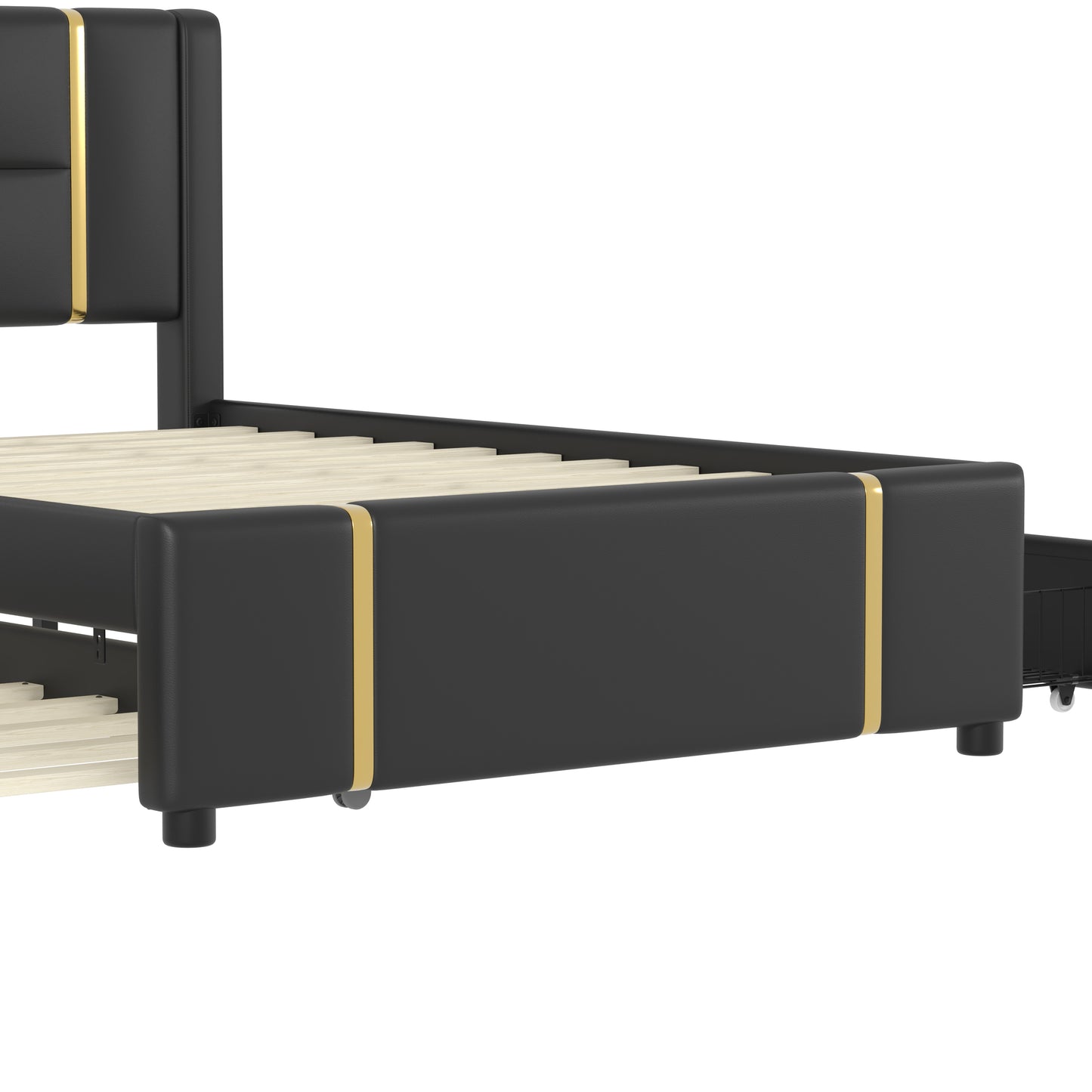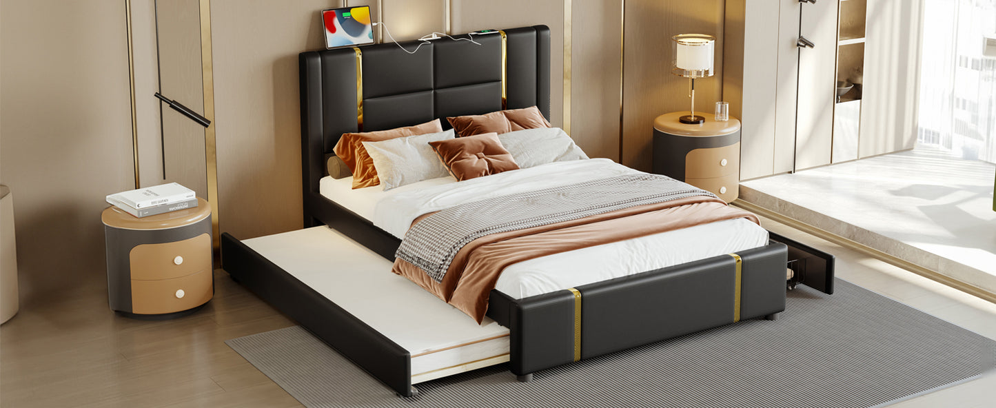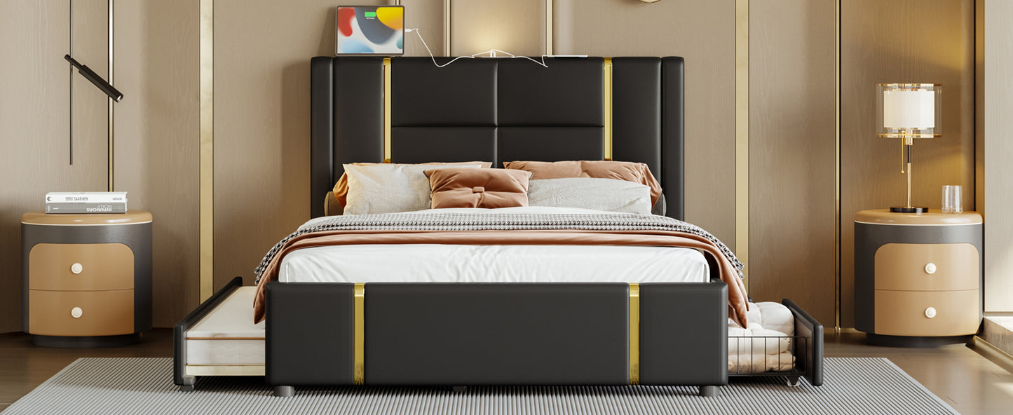 Transform your bedroom with this modern upholstered platform bed, designed for style, comfort, and functionality. Featuring a sleek design with luxurious gold accents, this bed exudes sophistication while seamlessly blending into any décor.Equipped with a convenient trundle bed, it's perfect for accommodating guests or creating extra sleeping space. Two spacious drawers provide ample storage for bedding, clothes, or other essentials, keeping your room tidy and organized.The built-in night light offers soft illumination for a cozy ambiance, while the integrated USB charger ensures your devices stay powered up overnight. Crafted for durability and comfort, this bed is the perfect combination of practicality and elegance.