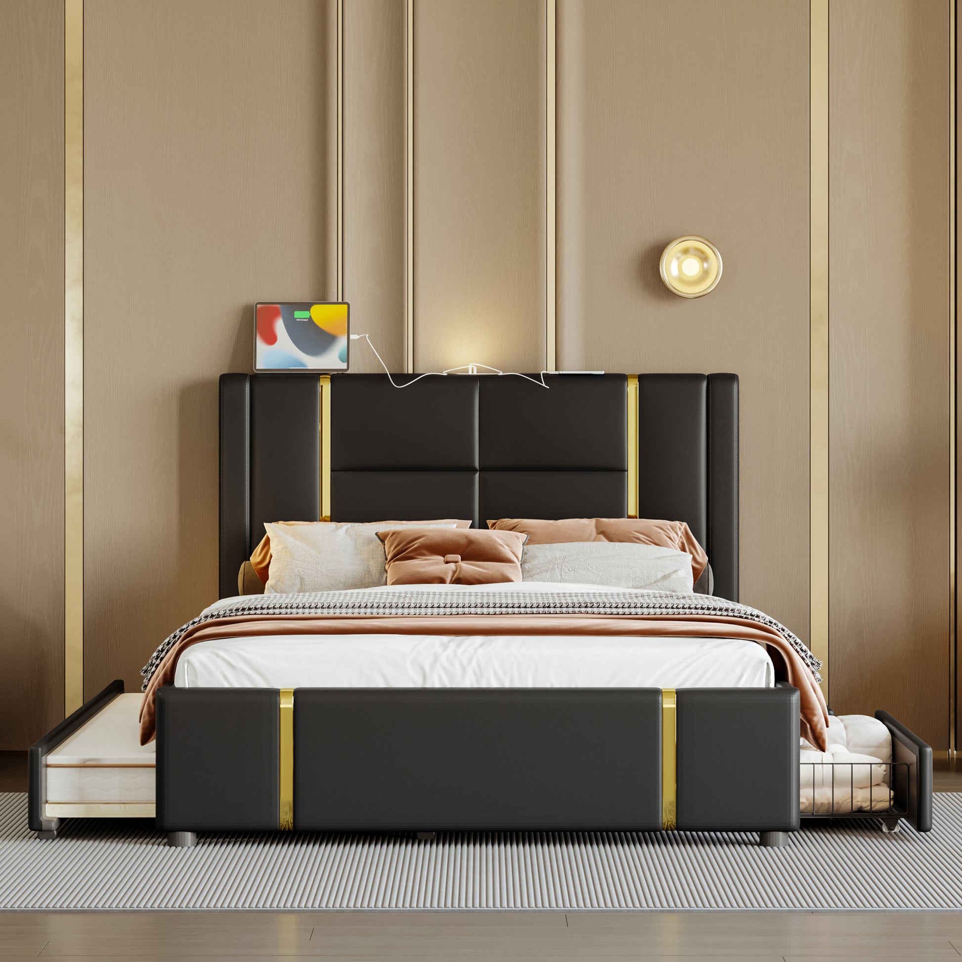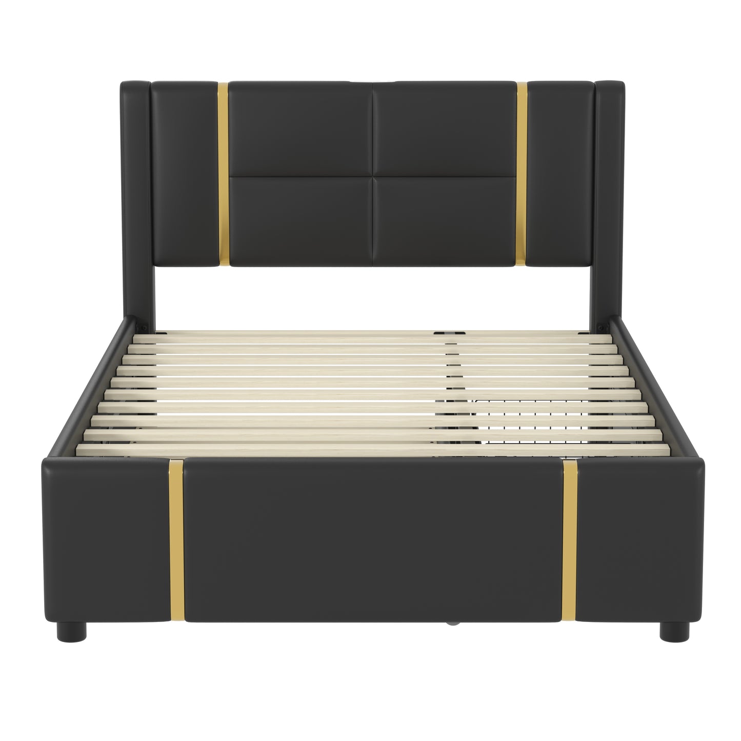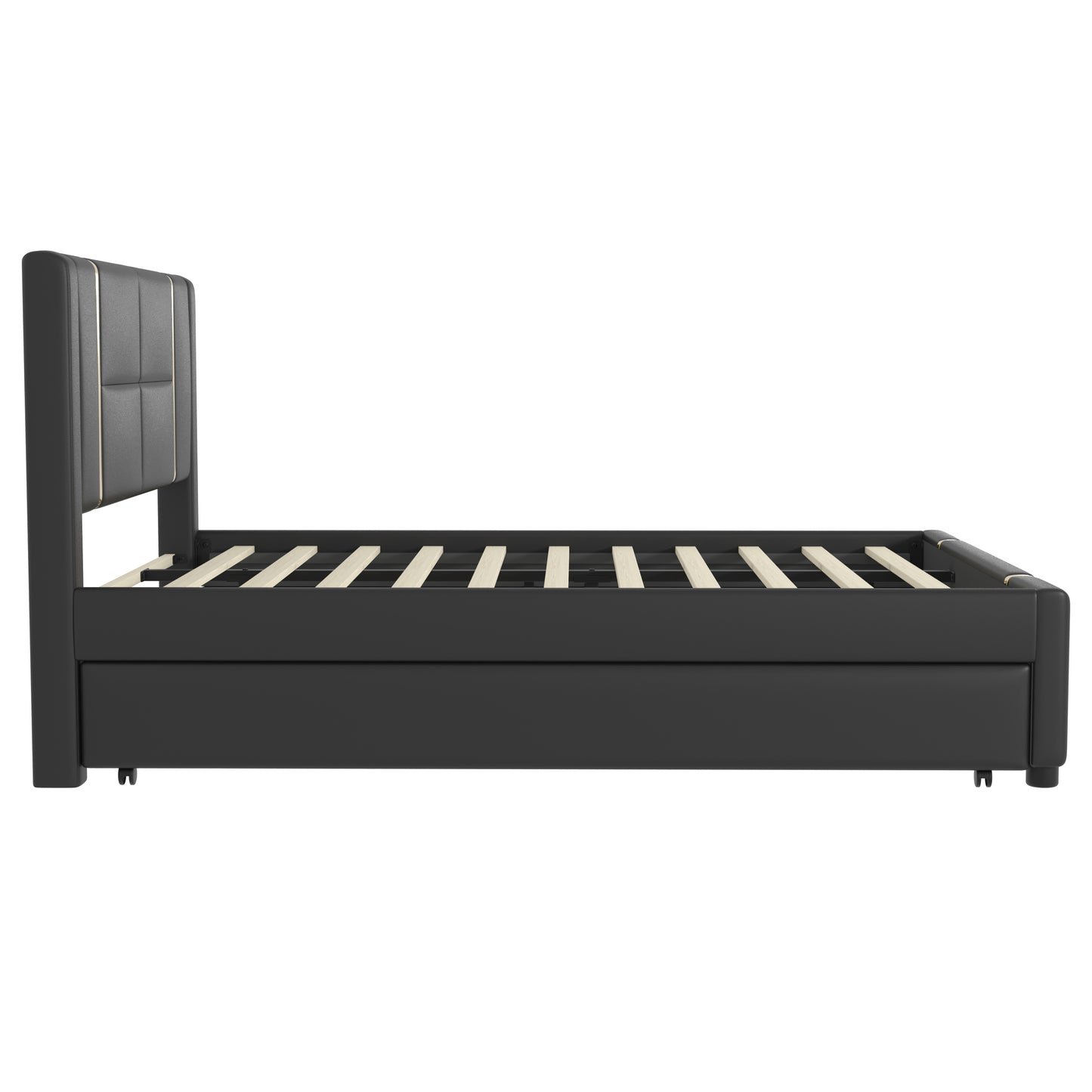 Transform your bedroom with this modern upholstered platform bed, designed for style, comfort, and functionality. Featuring a sleek design with luxurious gold accents, this bed exudes sophistication while seamlessly blending into any décor.Equipped with a convenient trundle bed, it's perfect for accommodating guests or creating extra sleeping space. Two spacious drawers provide ample storage for bedding, clothes, or other essentials, keeping your room tidy and organized.The built-in night light offers soft illumination for a cozy ambiance, while the integrated USB charger ensures your devices stay powered up overnight. Crafted for durability and comfort, this bed is the perfect combination of practicality and elegance.