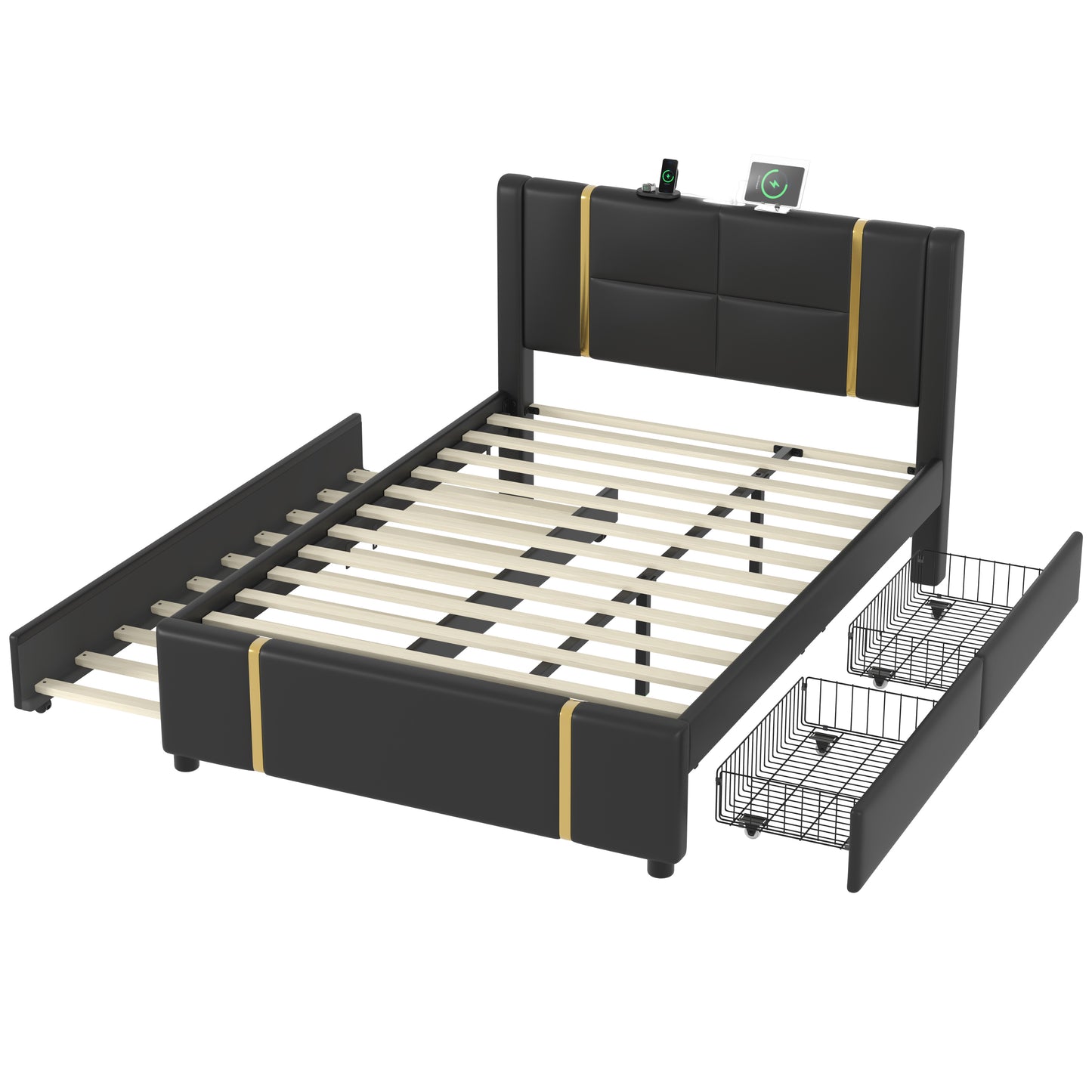 Queen Size Upholstered Bed with Trundle Bed and 2 Drawers,Modern Platform Bed with Gold Decoration, Night Light and USB Charger, Black