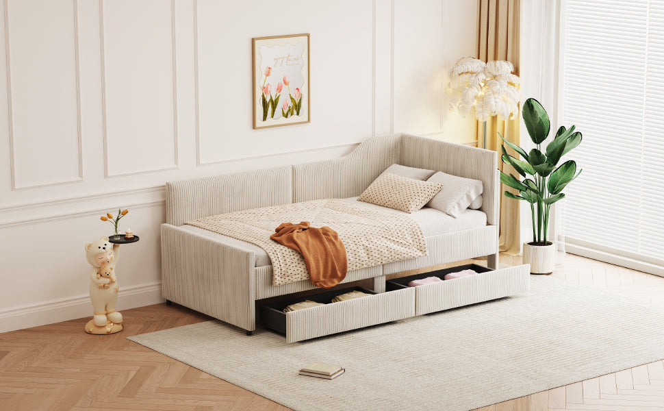 Twin Size L-Shaped Corduroy Daybed,Upholstered Bed Frame with 2 Storage Drawers, Beige