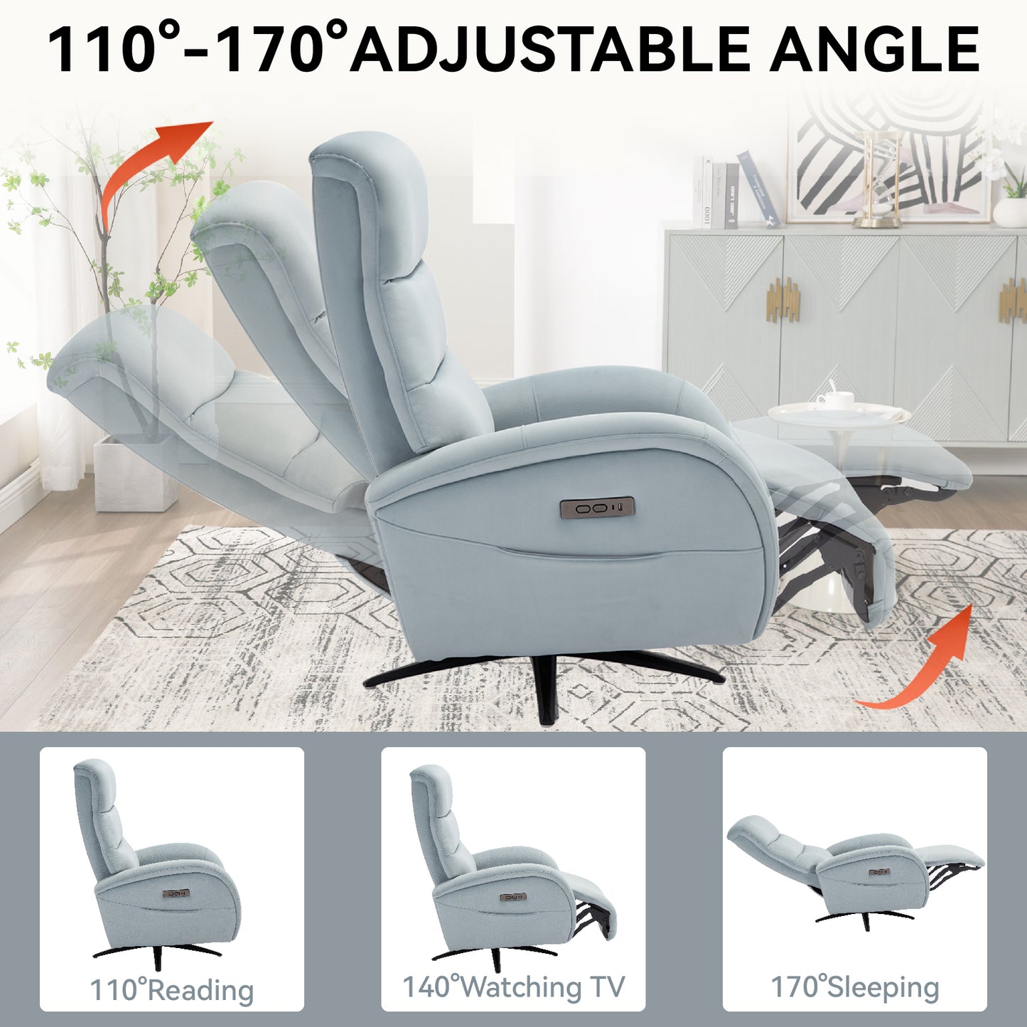 - POWER GLIDER SWIVEL RECLINER CHAIR: The smooth and gentle 270 degree swivel does not make the chair stiff when used; The 110-170degree recliner can satisfy you in various situation such as sitting and reading and watching TV, lying down, and resting, providing a comforting and stress-relieving, while USB and Type-C dual charging ports provide convenient charging for various electronic devices.