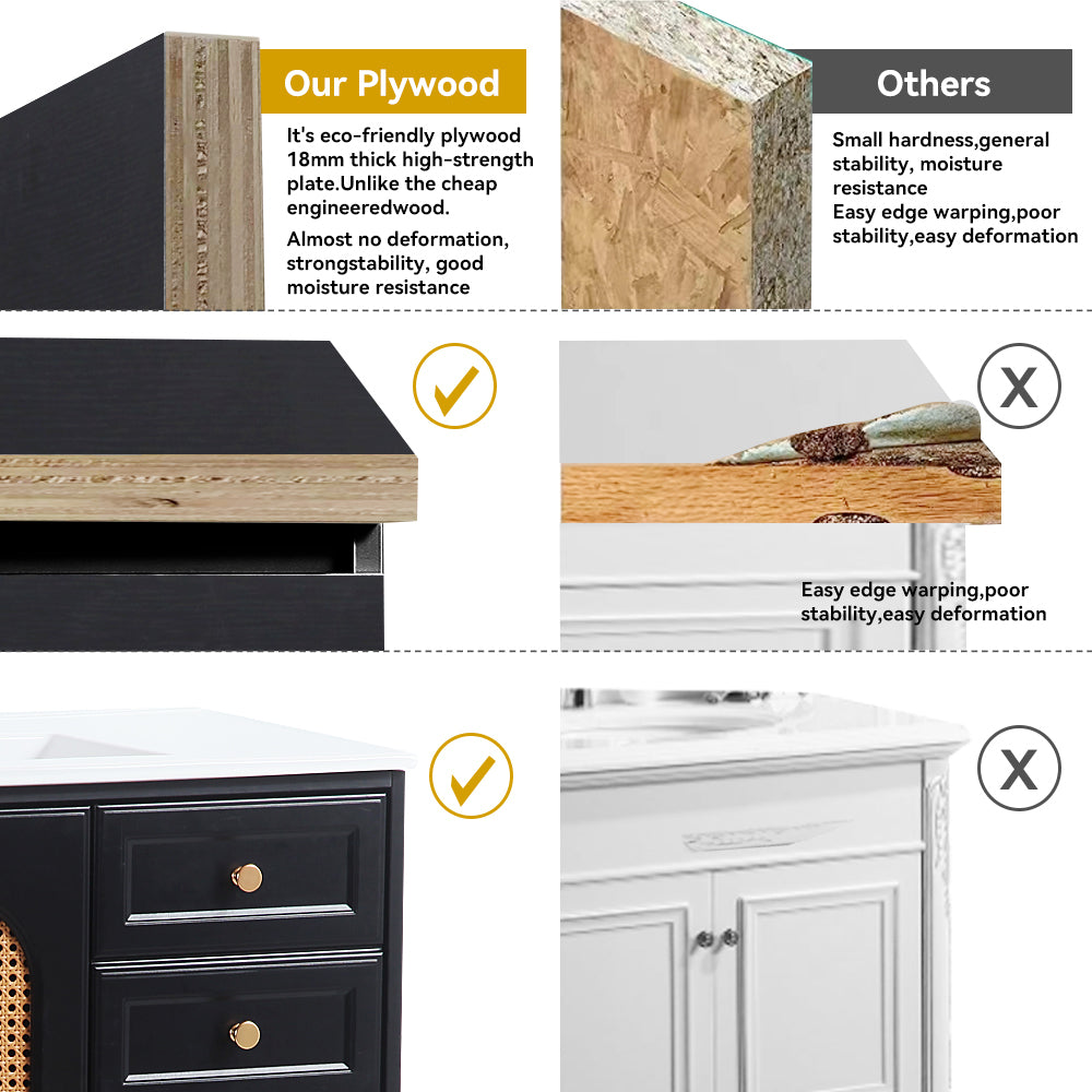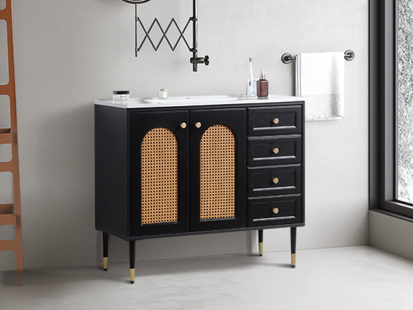36' Bathroom Vanity with Ceramic Basin, Rattan Bathroom Storage Cabinet with Two Doors and Drawer