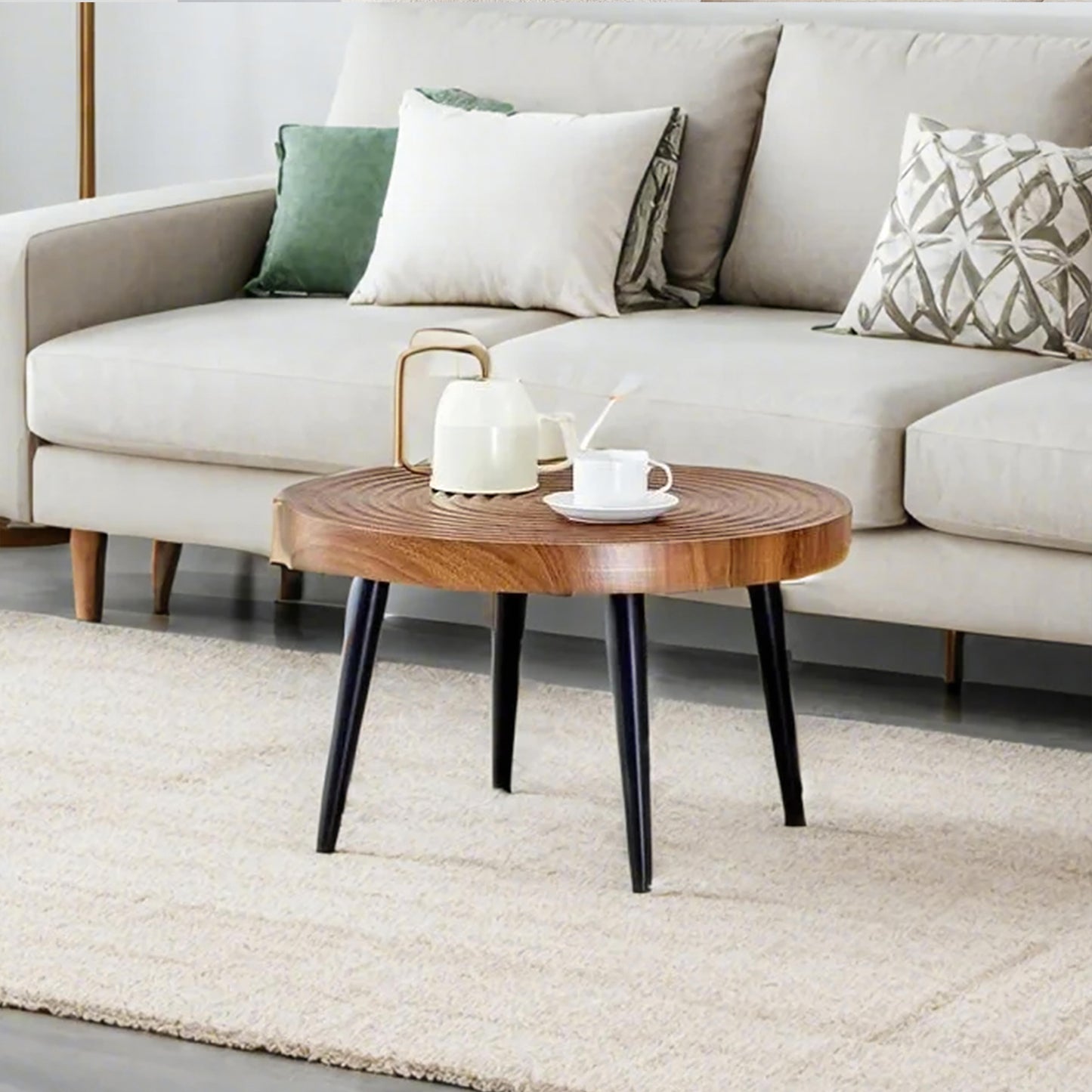 Natural Wood Grain Texture Round Coffee Table - Diameter 23.6 Inches.Exquisite Suction Molding Process,Natural Wood Grain Texture,Black Sprayed Metal Leg.
