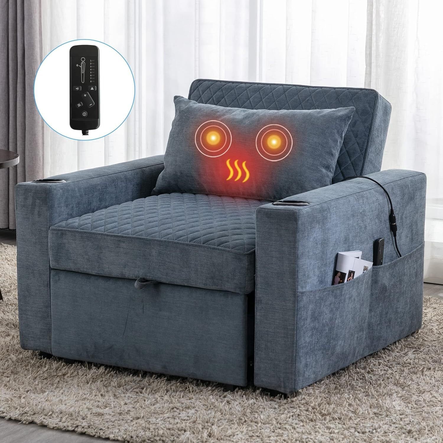 Convertible Sleeper Chair Bed with Massage and Heat Pillow, 3 in 1 Chair Bed Sleeper Multi-Functional Chair Sleeper Bed for Drawing Room,Bedroom, Office Sleeper Chair Bed for Adult(Blue)