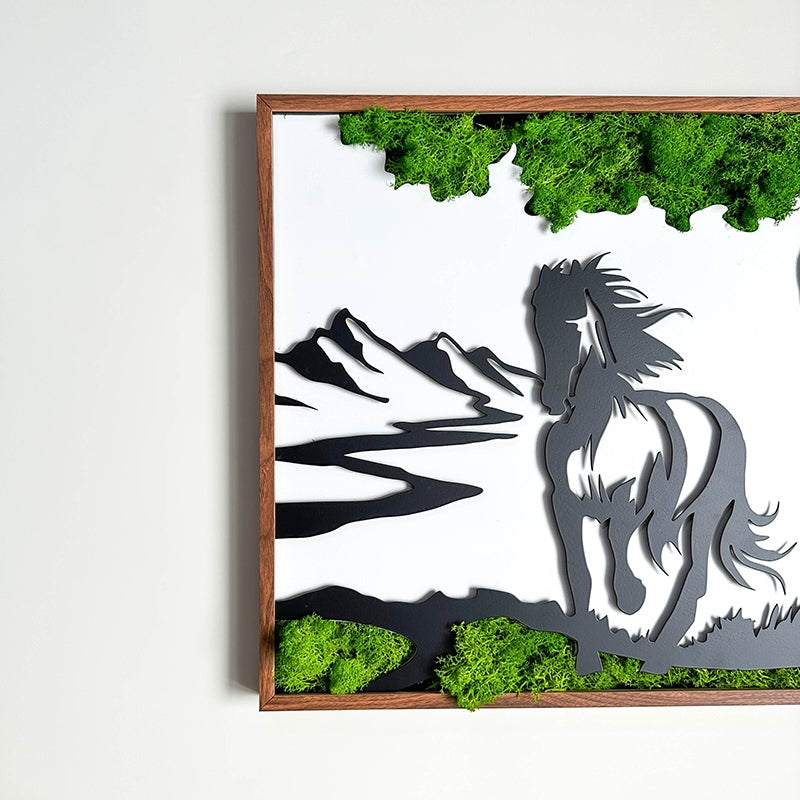 - Atmosphere and Ambiance: This wall decoration creates a serene and nature-inspired atmosphere in any space. The galloping horse artwork and the lush green preserved moss evoke a sense of movement, tranquility, and connection to the natural world, enhancing the overall ambiance of the room.