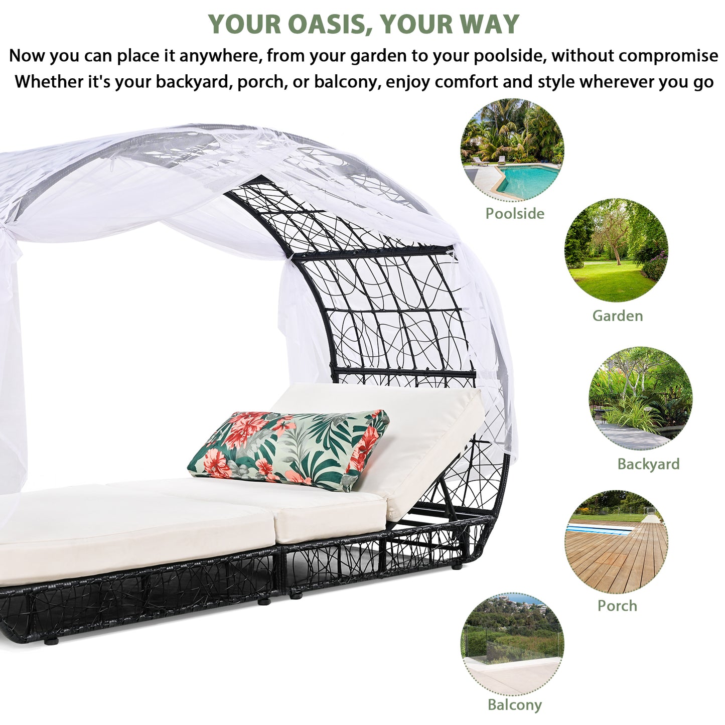 GO 90.55' Outdoor Patio Daybed with Curtain, Sunbed with Cushion and Colorful Pillow, Wicker Lounge Chairs Backrest Adjustable Recliners for Pool Garden Backyard, Beige Cushion, Black Wicker
